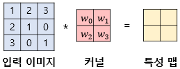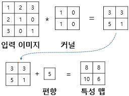 위와 같이 입력으로부터 커널을 사용하여 합성곱 연산을 통해 나온 결과를 특성 맵(feature map)이라고 합니다.