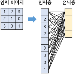 다층 퍼셉트론으로 3 × 3 이미지를 처리한다고 가정해보겠습니다. 우선 이미지를 1차원 텐서인 벡터로 만들면, 3 × 3 = 9가 되므로 입력층은 9개의 뉴런을 가집니다. 그리고 4개의 뉴런을 가지는 은닉층을 추가한다고 해보겠습니다. 이는 아래의 그림과 같습니다.