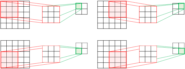 아래의 예제는 스트라이드가 2일 경우에 5 × 5 이미지에 합성곱 연산을 수행하는 3 × 3 커널의 움직임을 보여줍니다. 최종적으로 2 × 2의 크기의 특성 맵을 얻습니다.