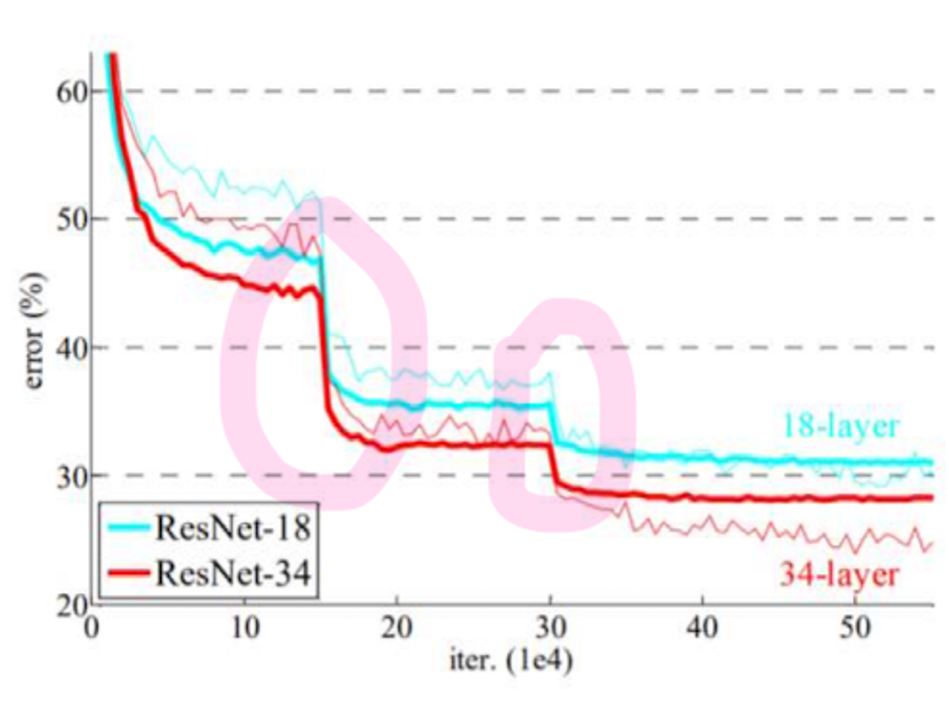 그래프를 살펴보면 급격이 error rate이 떨어지는 구간이 발생한다. 이는 Saturation이 발생하여 Learning rate를 튜닝하는 과정에서 발생하는 것이다.
