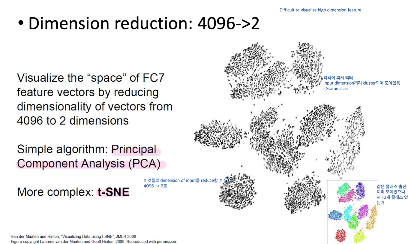 오른쪽 그림은 학습 후에 pixel space가 아니라, feature space(CNN에서 나온 4096-dim feature vectors)에서 L2 Nearst Neighbors를 적용한 것이다. 이를 보면 픽셀 값의 차이가 커도 feature가 비슷하면 비슷한 이미지로 계산한다. 코끼리를 보면 머리의 방향이 달라 픽셀 값의 차이가 매우 다름에도 같은 코끼리로 학습하여 비슷한 feature을 갖는다.