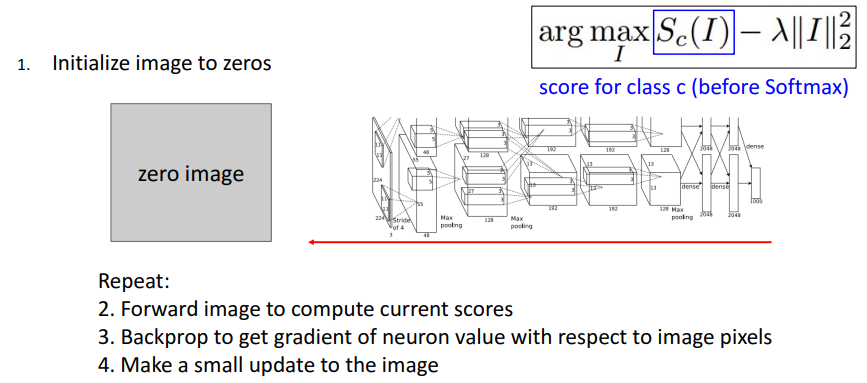 ➡️ 즉, 가중치를 최적화하는 것이 아니라 뉴런 또는 클래스 스코어가 최대화될 수 있도록 입력 이미지의 픽셀값을 바꿔주는 방법이다.