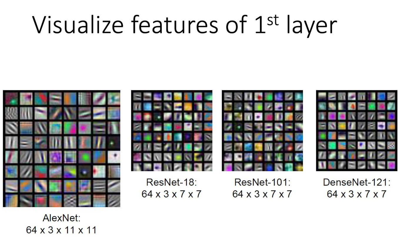 첫 번째 layer에서 하는 것은 convolution1, activation1 ⇒ 할 수 있는 게 많지 않으니까 low level 나온다.