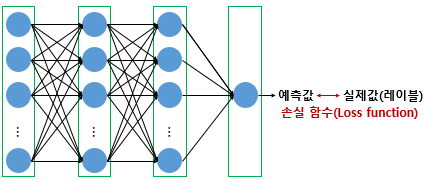 손실 함수는 실제값과 예측값의 차이를 수치화해주는 함수입니다. 이 두 값의 차이. 즉, 오차가 클 수록 손실 함수의 값은 크고 오차가 작을 수록 손실 함수의 값은 작아집니다. 회귀에서는 평균 제곱 오차, 분류 문제에서는 크로스 엔트로피를 주로 손실 함수로 사용합니다. 손실 함수의 값을 최소화하는 두 개의 매개변수인 가중치 w와 편향 b의 값을 찾는 것이 딥 러닝의 학습 과정이므로 손실 함수의 선정은 매우 중요합니다.