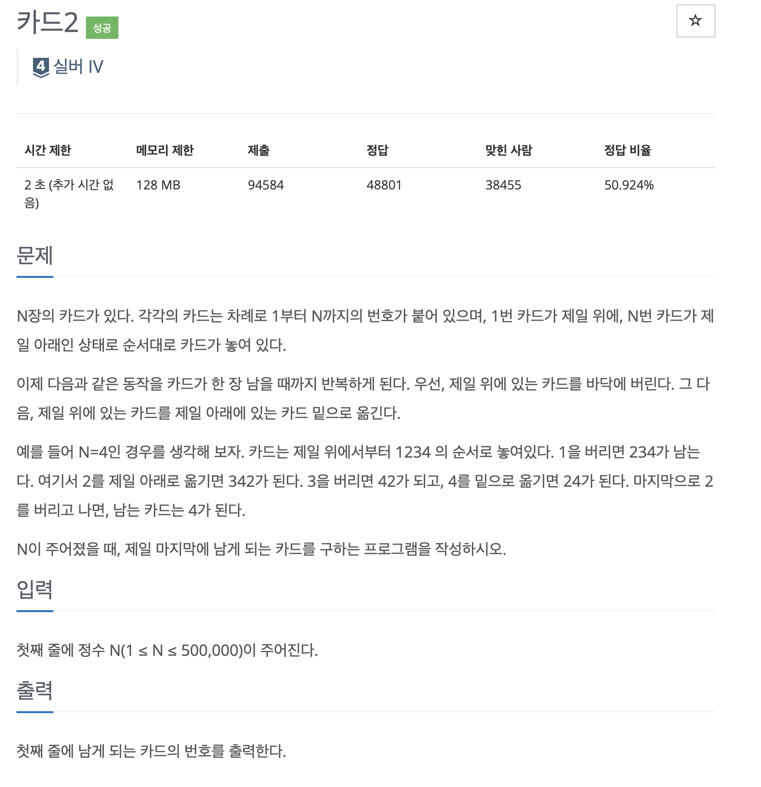 N장의 카드가 있다. 각각의 카드는 차례로 1부터 N까지의 번호가 붙어 있으며, 1번 카드가 제일 위에, N번 카드가 제일 아래인 상태로 순서대로 카드가 놓여 있다. 이제 다음과 같은 동작을 카드가