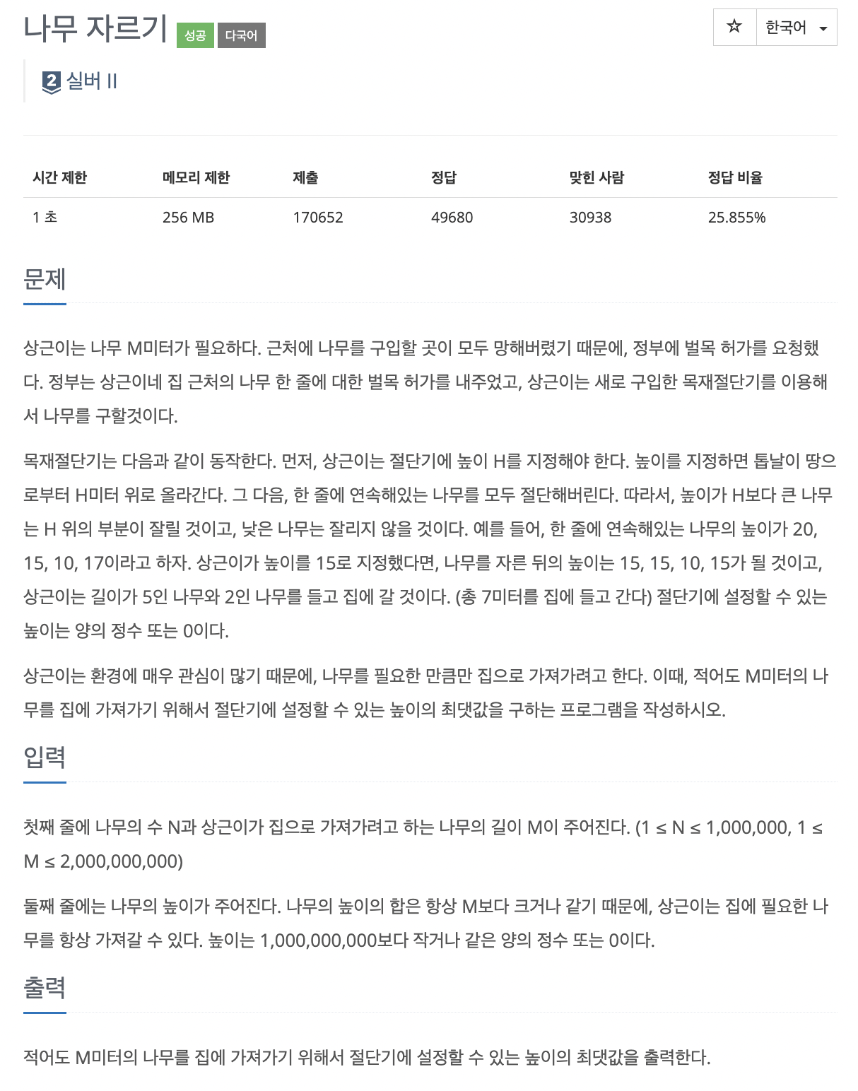 첫째 줄에 나무의 수 N과 상근이가 집으로 가져가려고 하는 나무의 길이 M이 주어진다. (1 ≤ N ≤ 1,000,000, 1 ≤ M ≤ 2,000,000,000) 둘째 줄에는 나무의 높이가 주어진다. 나무의 높이의 합은 항상 M보