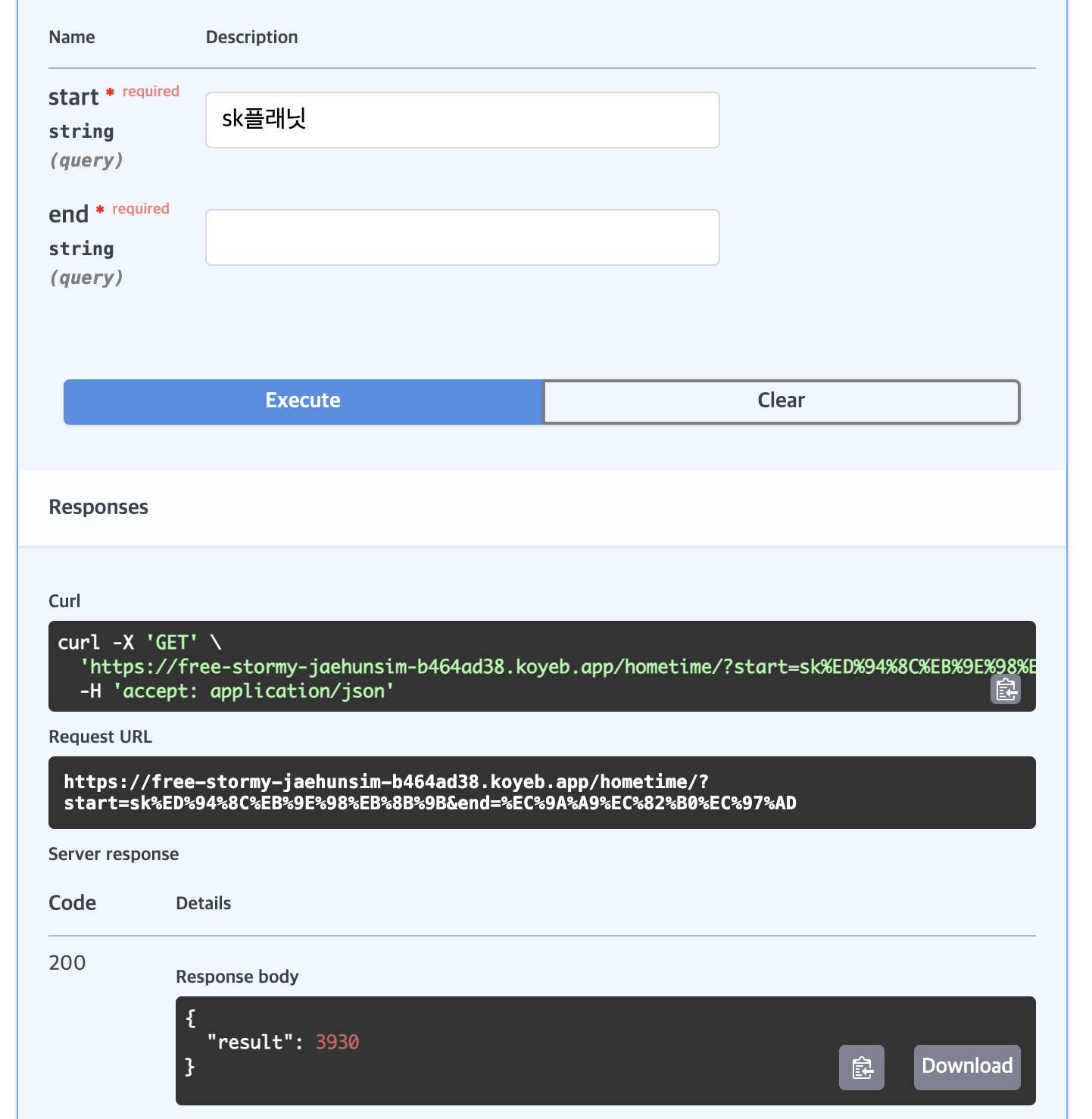 TMAP API와 FastAPI를 활용한 백엔드 서버를 개발하여 출발지와 도착지를 입력하면 시간 예측 정보를 제공하는 프로젝트였습니다!